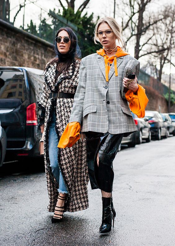 Kárované sako ako hlavný protagonista doplnené akcentujúcou farebnosťou , streetstyle oufit z ulíc Paríža, Paris Fashion Week , jar 2018, zdroj: pinterest